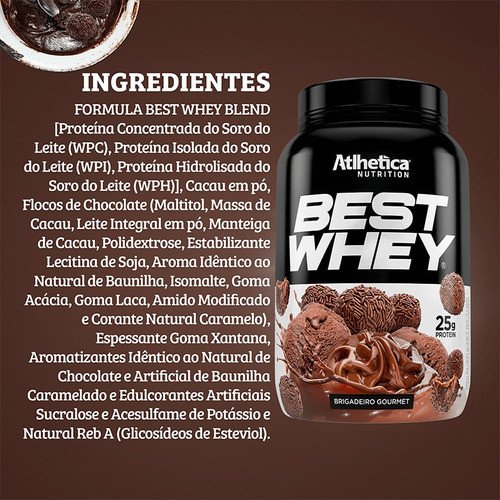 FORMULA BEST WHEY BLEND [Proteína Concentrada do Soro do Leite (WPC),Proteína Isolada do Soro do Leite (WPI),Proteína Hidrolisada do Soro do Leite(WPH)], Cacau em pó, Flocos de Chocolate (Maltitol, Massa de Cacau, Leite Integral em pó, Manteiga de Cacau, Polidextrose, Estabilizante Lecitina de Soja, Aroma Idêntico ao Natural de Baunilha, Isomalte, Goma Acácia, Goma Laca, Amido Modificado e Corante Natural Caramelo), Espessante Goma Xantana, Aromatizantes Idêntico ao Natural de Chocolate e Artificial de Baunilha Caramelado e Edulcorantes Artificiais Sucralose e Acesulfame de Potássio e Natural Reb A (Glicosídeos de Esteviol).