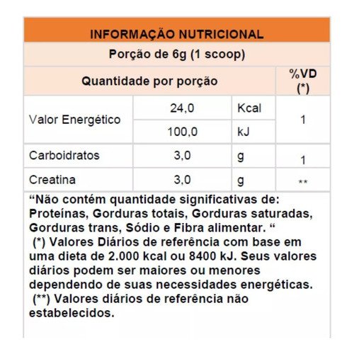 Creatina monohidratada, Maltodextrina, edulcorante sucralose e antiumectante dióxido de silício.