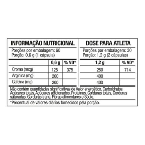 Cafeína anidra, L-Arginina, picolinato de cromo, estabilizantes (celulose microcristalina e amidextrina), e dióxido de silício.